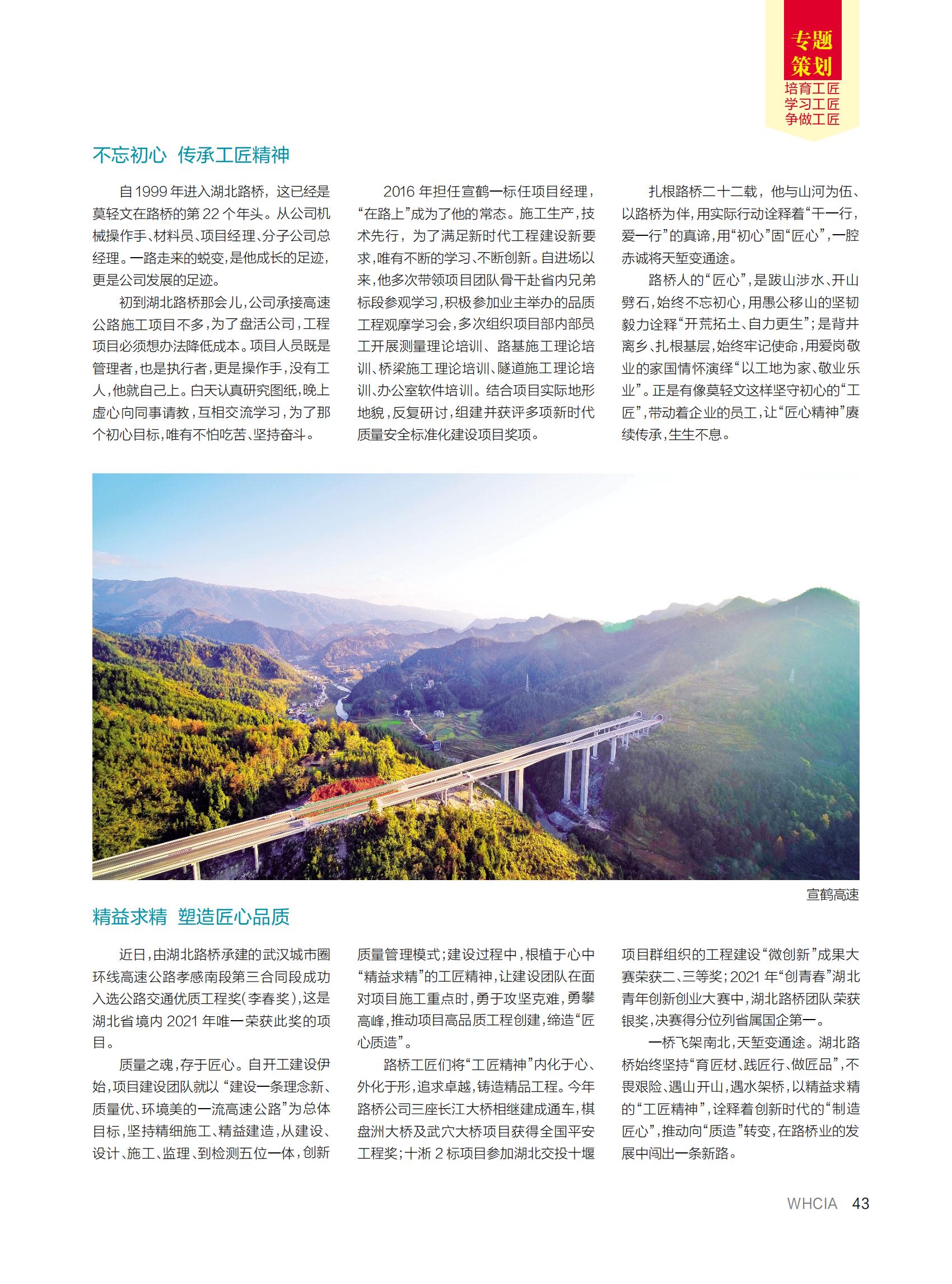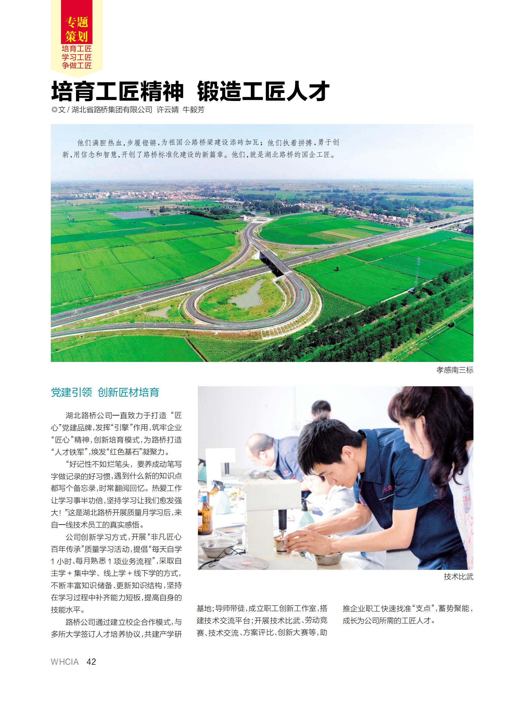 近日,湖北路桥撰写的《培育工匠精神 锻造工匠人才》一文,登上武汉建筑业协会主办的《武汉建筑业》杂志“工匠精神”专题策划版,以下为全文: